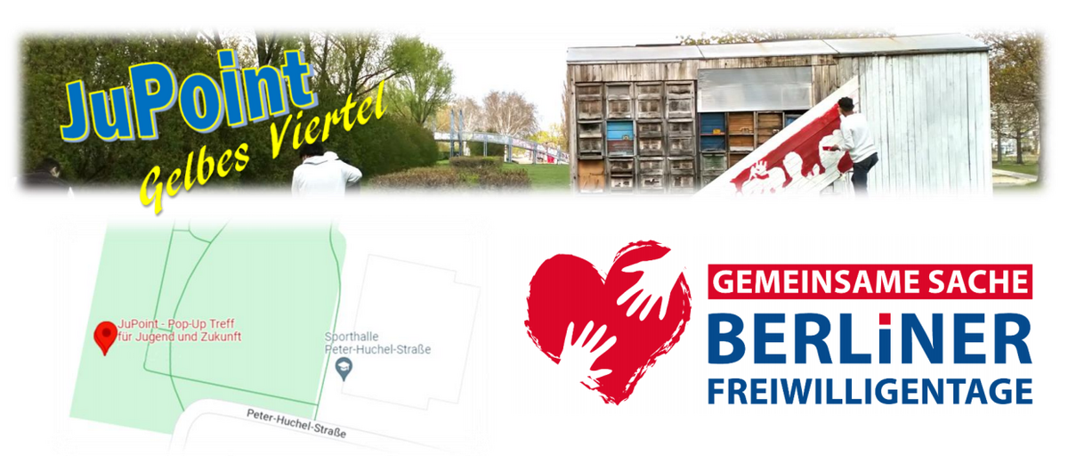 Während der Berliner Freiwilligentage - am 15./16. September, 13 - 18 Uhr - wird mit Jugendlichen (und weiteren Mitstreitende) bei JuPoint Gelbes Viertel gebaut, und diese Tage geben uns Anlass für Treffen unter Nachbarn, Ideen zu Aktivitäten bei JuPoint zu besprechen, Termine zu finden und gleich loszulegen. Nach Absprache können Tische und Bänke, Spielgeräte etc. aus dem Bienenwagen immer genutzt werden.